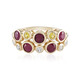 Geniet van het levendige contrast van Mozambikaanse robijnen en Ceylon gele saffieren met deze chique 375 gouden ring. Met 1,902 ct glanzende robijnen, aangevuld met 0,249 ct fonkelende saffieren, getuigt dit sieraad van elegantie. Cambodjaanse zirkonia's voegen een extra fonkeling toe, met een totaal van 0,435 ct, gevat in een geraffineerd ontwerp van 23x23 mm. Perfect voor die speciale avondjes uit of om een vleugje kleur toe te voegen aan je alledaagse kleding, deze ring zal zeker bewondering oogsten en elk ensemble opwaarderen.