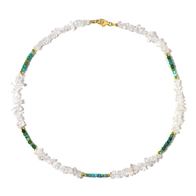 Ontdek elegantie met deze prachtige ketting met kralen van Braziliaanse witte kwarts en Amerikaanse turkoois, geaccentueerd door gouden hematiet. De kralen, in verschillende maten en met facetgeslepen motieven, zijn prachtig gezet in verguld 925 sterlingzilver. Deze ketting is perfect voor zowel casual als formele gelegenheden en zal je ensemble moeiteloos verbeteren. Combineer met een eenvoudige jurk voor een chique look.