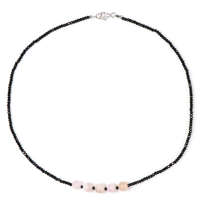 Ontdek de allure van contrasterende tinten met deze meesterlijk bewerkte ketting. Door de donkere elegantie van Thaise zwarte spinelkralen te combineren met de zachte warmte van Madagaskische Morganiet straalt deze 925 Sterling Zilveren ketting verfijning uit. Met een totaal gewicht van 41,88 karaat vormen de gefacetteerde spinelkralen een fascinerende achtergrond voor de gladde morganietbolletjes. Deze ketting van 45 cm is ideaal voor zowel formele evenementen als chique vrijetijdskleding, accentueert sierlijk de halslijn en voegt een vleugje verfijnde glamour toe aan elk ensemble.