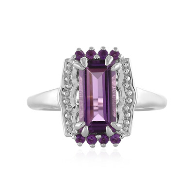 Deze 925 sterling zilveren ring heeft een prachtige Braziliaanse amethist als middelpunt. De belangrijkste edelsteen, geslepen in een verfijnde baguettevorm, meet ongeveer 10x5 mm en weegt 1,287 ct, pronkend met zijn levendige paarse tint. Rondom het opvallende middelpunt zitten acht rondgeslepen amethisten met een gezamenlijk gewicht van 0,117 ct, die het algehele ontwerp van de ring aanvullen en de kleurintensiteit verrijken. Dit prachtige stuk weegt ongeveer 3,71 g en heeft een spanwijdte van 23x20 mm, waardoor het een indrukwekkende aanvulling is op elke sieradencollectie. Deze ring is ideaal voor elegante soirees of een geraffineerd accent aan alledaagse kleding en belooft te betoveren en te charmeren.
