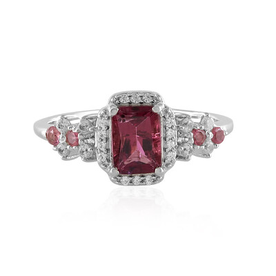 Deze sterling zilveren ring is een prachtig staaltje vakmanschap en is voorzien van een 0,91ct Nigeriaanse roze toermalijn met een stralende achthoekige slijpvorm als middelpunt. Omringd door een halo van Cambodjaanse zirkoon en geflankeerd door andere roze toermalijnen, heeft de ring een totaal edelsteengewicht van 1,26 karaat. De platina plating is perfect voor speciale gelegenheden of om dagelijks te dragen en voegt een duurzaam vleugje luxe toe. Combineer hem met een klassieke cocktailjurk om tijdloze elegantie uit te stralen.