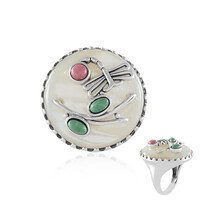 Ontdek elegantie met de Desert Chic Parelmoer Zilveren Ring. Uitgelicht door Chinese parelmoer en aangevuld met levendige groene turquoise en Australische rhodoniet cabochons, biedt dit sterling zilveren stuk een unieke mix van kleuren. Deze ring is perfect om een vleugje verfijning toe te voegen aan casual of avondoutfits en is zowel een statement als een veelzijdig accessoire. Ideaal voor elke gelegenheid.