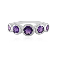 Deze fascinerende ring heeft een vijftal Siberische amethisten van in totaal 1,889 karaat, elegant gemonteerd op platina verguld 925 sterling zilver. Elke edelsteen is zorgvuldig rondgeslepen en vertoont dieppaarse tinten die doen denken aan de rijke Siberische lucht. Het ontwerp is een prachtige mix van moderne charme en klassieke elegantie, ideaal voor zowel casual uitjes als formele evenementen. Deze ring past perfect bij een cocktailjurk of voegt een vleugje kleur toe aan je kantoorkleding en is een veelzijdige aanvulling op elke sieradencollectie.