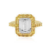 Verblind en schitter met deze spectaculaire vergulde 925 sterling zilveren ring, met als pronkstuk een prachtige 4,69ct achthoekige Cambodjaanse zirkoon. Omringd door een halo van 24 rondgeslepen gele saffieren uit Madagaskar, meet deze creatie met een totaal edelsteengewicht van 5,66ct 25x22 mm en is daarmee een luxueus statement. Ideaal voor elegante avonden of als geraffineerd accessoire bij uw professionele kleding, de glanzende aanwezigheid zal zeker betoveren.