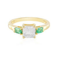Ontdek de allure van deze vergulde sterling zilveren ring, met een oogverblindende 2,599 ct Cambodjaanse zirkoon met een unieke achthoekige Asscher slijpvorm in het midden, geflankeerd door twee levendige Russische smaragden van in totaal 0,509 ct in een harmonieuze achthoekige slijpvorm. Met een gecombineerd edelsteengewicht van 3,108 ct is dit sieraad niet zomaar een ring, maar een statement van elegantie. Het geraffineerde contrast van heldere zirkoon en weelderige groene smaragden is een aanvulling op formele kleding en voegt een vleugje weelde toe aan alledaagse outfits.