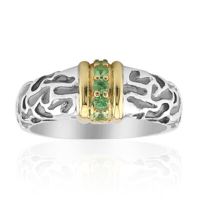 Deze opvallende ring, ontworpen door Remy Rotenier, toont de levendige schoonheid van vijf rondgeslepen Keniaanse tsavorieten van in totaal 0,128 ct, aangevuld met een glinsterende Tanzaniaanse zirkoon van 0,006 ct. Gegoten in 925 Sterling Zilver van hoge kwaliteit met een gewicht van ongeveer 3,26 g, belichaamt dit sieraad een chique contrast met zijn geaccentueerde gouden plating. Het unieke bandontwerp van 22x20 mm voegt een artistiek tintje toe aan deze elegante creatie. Deze ring is ideaal om kleur toe te voegen aan zowel casual als formele outfits en getuigt van hedendaagse elegantie en stijl.