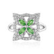 Ontdek elegantie met deze prachtige zilveren ring, met prachtige tsavorieten uit Tanzania en fonkelende Cambodjaanse zirkonen in een bloemvormig ontwerp. Deze ring is gemaakt van platina geplateerd 925 sterling zilver en is perfect voor zowel alledaags gebruik als voor speciale gelegenheden. Het briljante groen en de stralende schittering maken het een ideaal statementstuk, dat prachtig staat bij zowel casual als formele kleding.