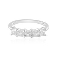 Sierlijk en tijdloos, deze sterling zilveren ring heeft een line-up van vijf glanzende Cambodjaanse zirkonen, met een gezamenlijk gewicht van 0,972 karaat. Elke zirkoon is meesterlijk geslepen in een vierkante prinsesvorm van ongeveer 3 mm elk, waardoor het licht prachtig wordt gereflecteerd. De 925 sterling zilveren band, die ongeveer 1,6 gram weegt, vult de fonkelende zirkonia's aan met zijn glanzende afwerking. Deze ring is ideaal voor alledaagse elegantie of als glinsterende aanvulling op avondkleding en is een veelzijdig stuk voor elke sieradencollectie.